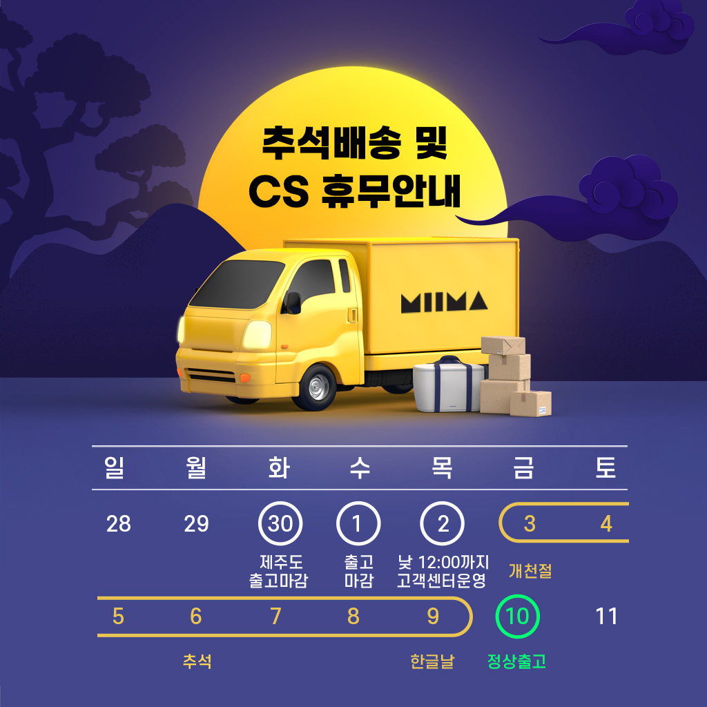 안녕하세요. 미마입니다😃 2025년 한가위 연휴 추석 배송 일정을 안내드립니다. 미마 지정 택배사의 휴무로 인하여 10월 1일 오후 1시 이전 주문건까지는 당일 출고되며, 10월 2일 오후 1시 이후 주문건부터는 10월 10일부터 순차 출고 됩니다. * 택배사 물량에 따라 배송 지연될 수 있는 점 양해 부탁드립니다. 2025년에도 미마와 함께 풍성한 한가위 되세요🎊